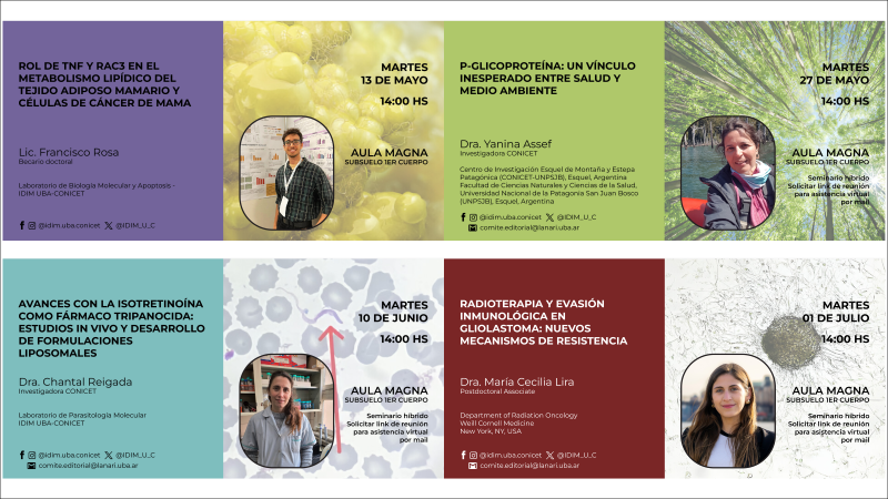 - Martes 13 de mayo. “Rol de TNF y RAC3 en el metabolismo lipídico del tejido adiposo mamario y células de cáncer de mama" Presentador: Lic. Francisco Rosa del Laboratorio de Biología Molecular y Apoptosis, (IDIM UBA-CONICET).