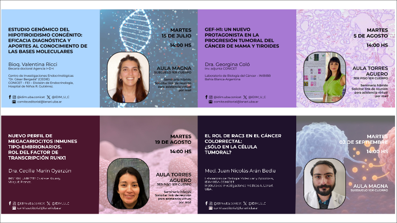 - Martes 2 de septiembre. "El rol de RAC3 en el cáncer colorrectal: ¿sólo en la célula tumoral?" Presentador: Med. Juan Nicolás Arán Bedia del Laboratorio de Biología Molecular y Apoptosis, (IDIM UBA-CONICET).