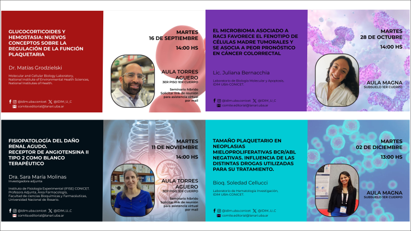 - Martes 16 de septiembre. "Glucocorticoides y Hemostasia: Nuevos conceptos sobre la regulación de la función plaquetaria" Presentador: Dr Matías Grodzielski, Molecular and Cellular Biology Laboratory, National Institute of Environmental Health Sciences, National Institutes of Health.
